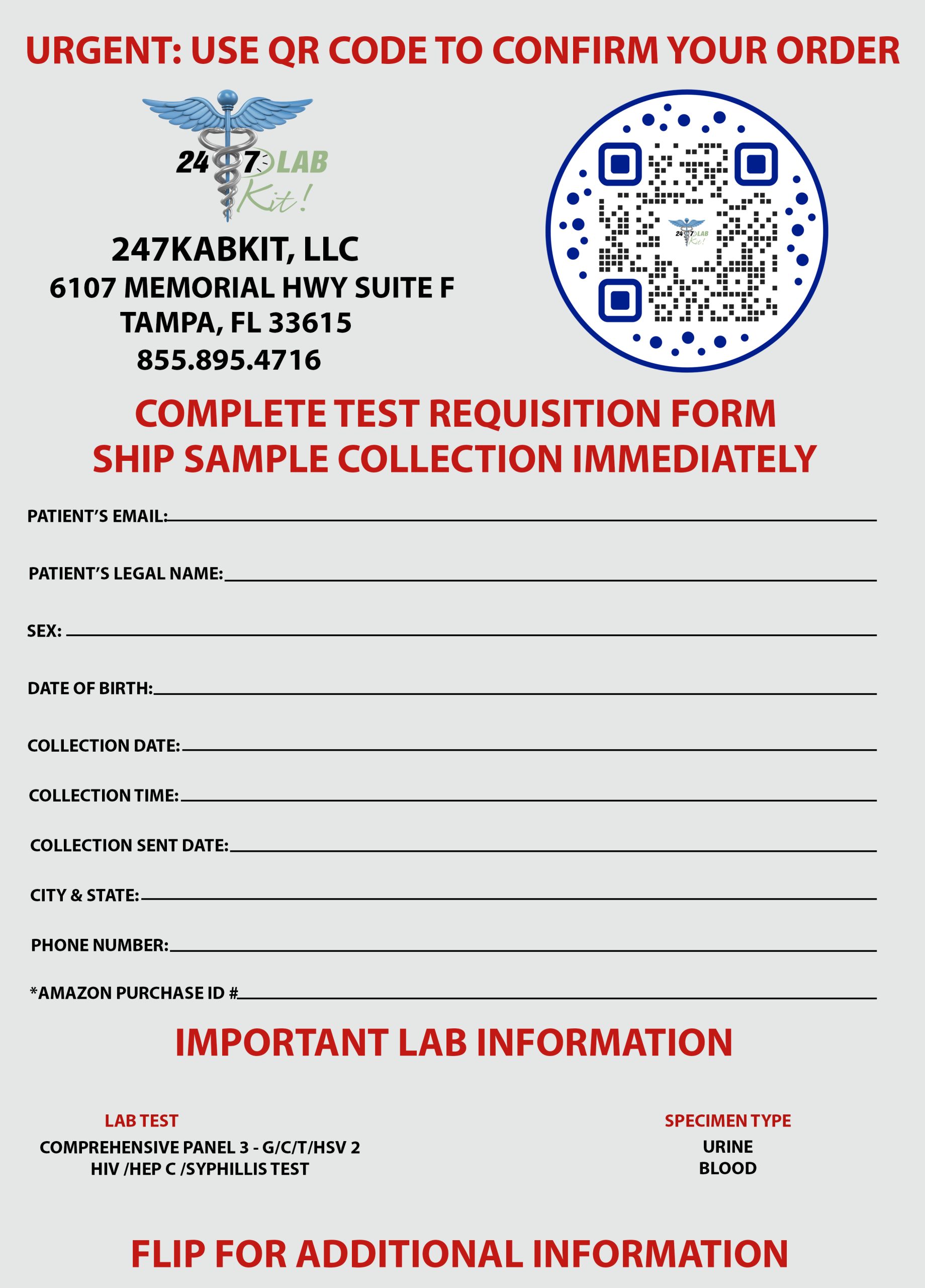 Check your sexual health status from the comfort of your home with 247Labkit Comprehensive Kit. Our testing kit allows you to discreetly and privately test for the most common sexually transmitted diseases, including Chlamydia, Gonorrhea, Trichomoniasis, Syphilis, Herpes, HIV, and Hepatitis C.